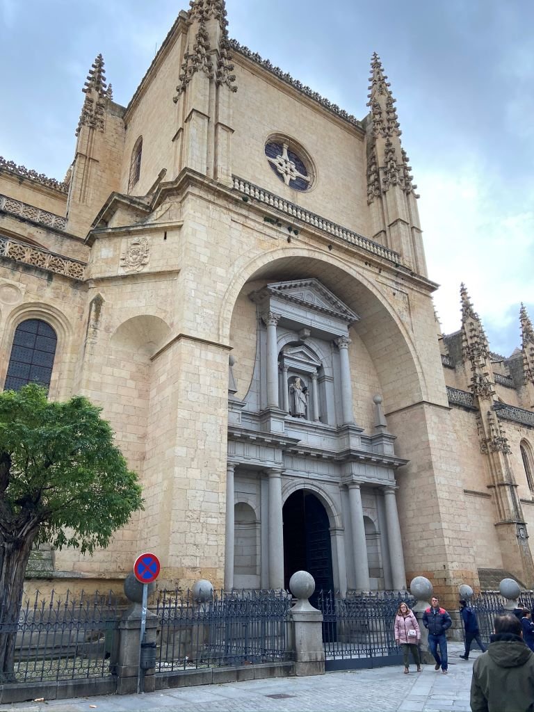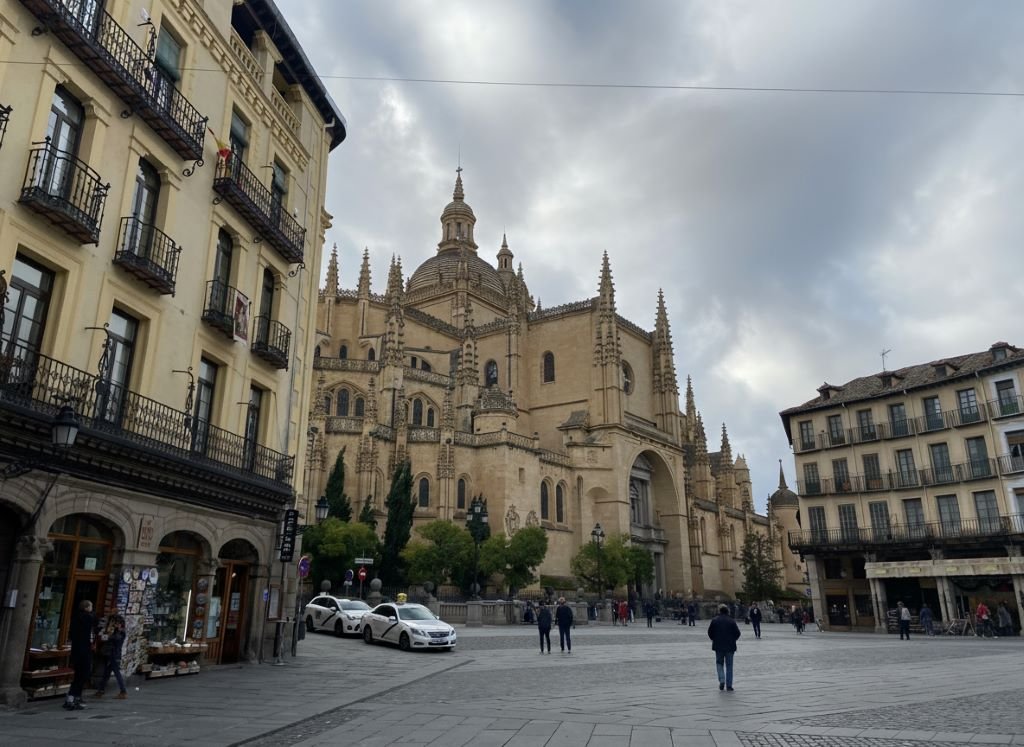 Passei pelo Alcázar de Segovia, o castelo com torres pontudas que dizem ter inspirado o da Cinderela da Disney. Vi a Catedral de Segovia, imensa e cheia de detalhes góticos, e caminhei pelo centro histórico como quem não quer perder nada — mesmo sem entrar em tudo.